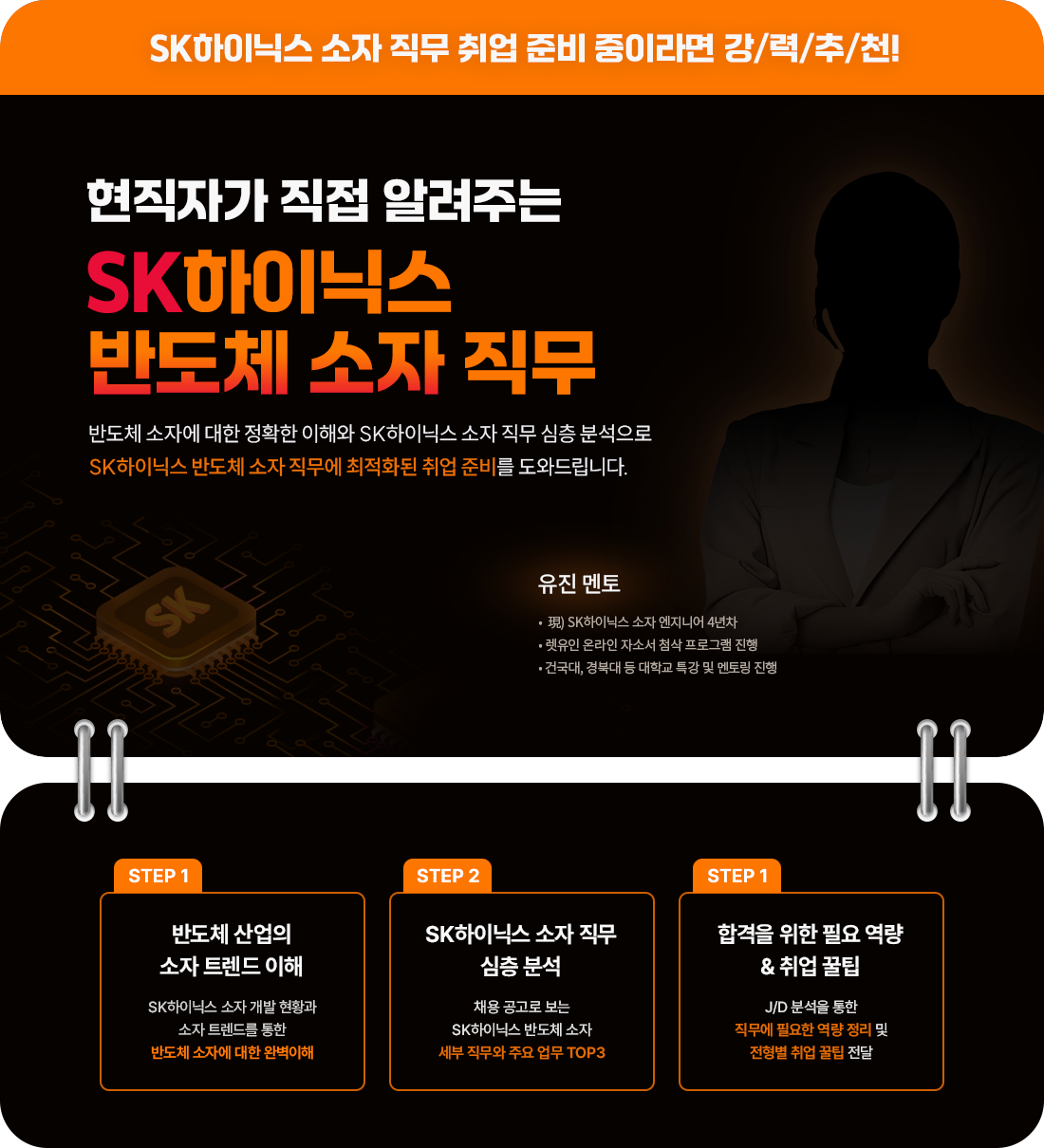 채용 공고와 JD(직무기술서)를 완벽히 해부하여 실무 역량을 정의하고, 각 전형별 합격 꿀팁까지 공개해 SK하이닉스 맞춤형 인재로 거듭나게 돕는 실무 밀착형 강의입니다.
